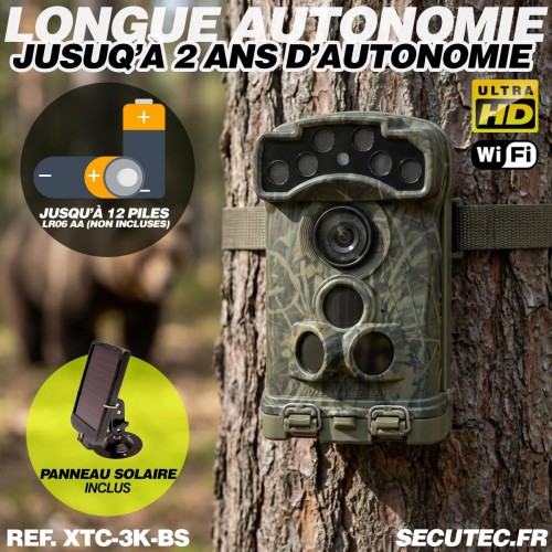 Caméra de Chasse solaire Wi-Fi 3K Ultra-HD Photos 32 MP, Vidéo 3K Audio, Vision Nocturne Invisible, IP68, box antivandal