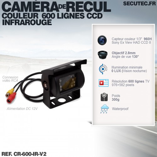Caméra de recul, intégrant un capteur 600 lignes TV 1/3" SONY EXView HAD CCD II avec une résolution de 976×582 pixels.