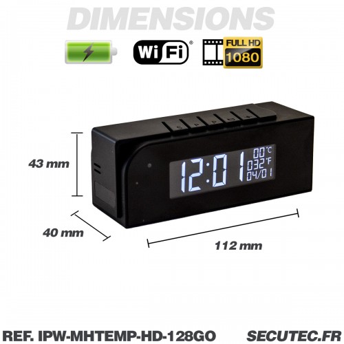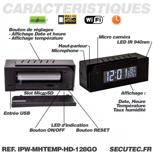 Horloge température de bureau avec micro caméra IP Wi-Fi HD avec vision nocturne microSD 128 Go incluse