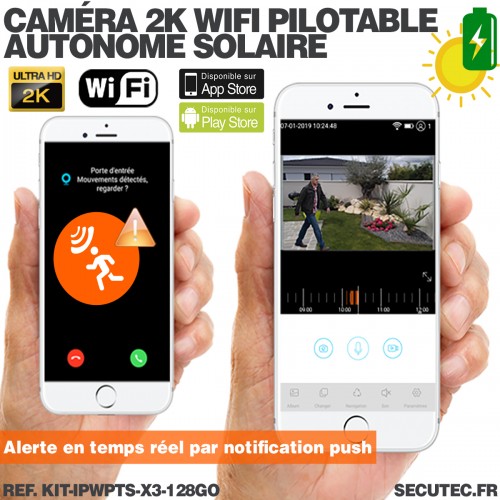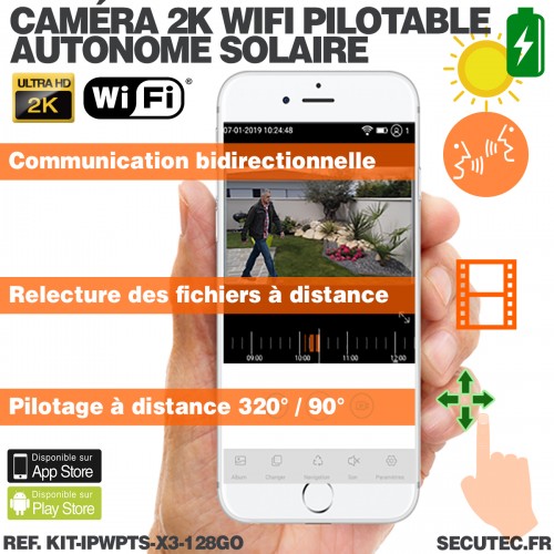 Caméra pilotable solaire IP WIFI UHD 2K 4Mpx waterproof infrarouge detection humaine accès à distance via iphone android 128Go inclus