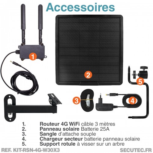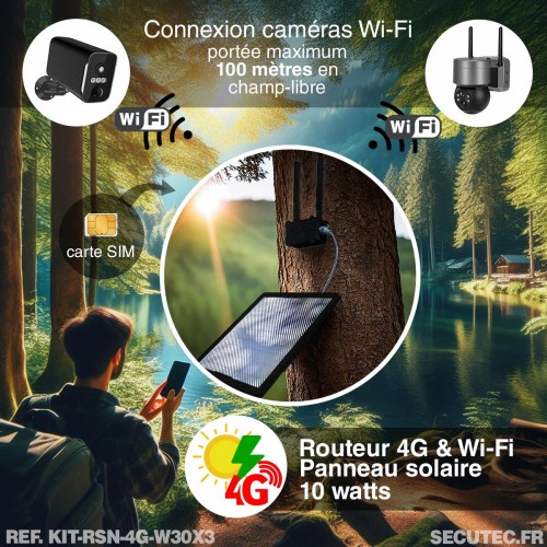 Kit de vidéosurveillance 100% autonome composé de 3 caméras solaires Wifi UHD 2K waterproof infrarouge ultra longue autonomie et d'un routeur 3G/4G industriel avec panneau solaire avec batterie, idéal pour surveiller une maison, un bâtiment où une résidence secondaire, s'il n'y a pas de connexion par box internet et d'alimentation.