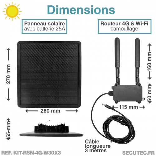 Le routeur offre une dimension 115×50×50 mm. La longueur du câble de liaison en le panneau solaire avec batterie et le routeur est de ~3 mètres.