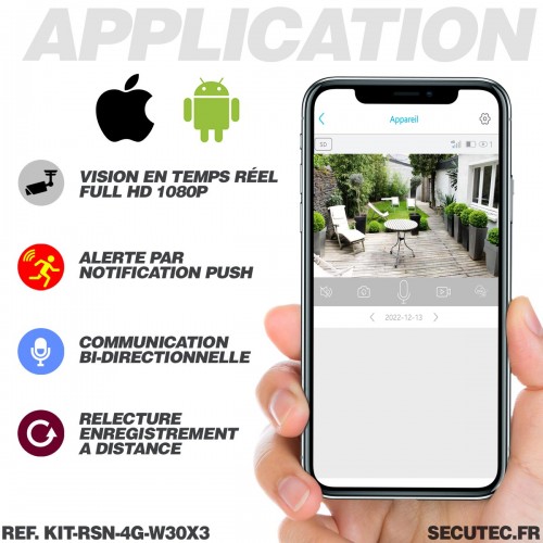 - Prise photographique, déclenchement manuel depuis l'application mobile.