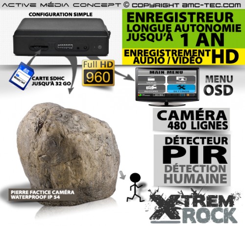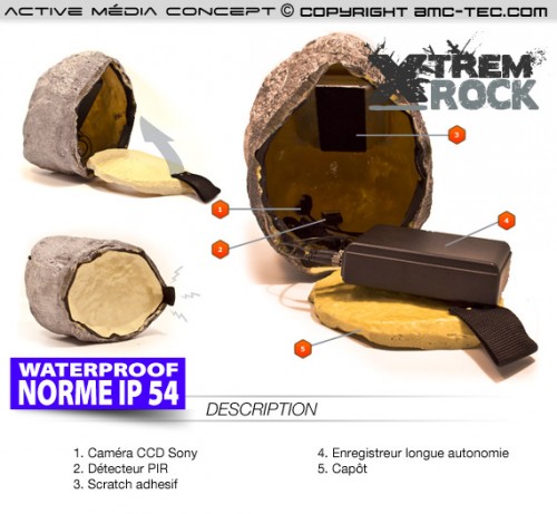 Caméra avec détecteur PIR et enregistreur audio vidéo intégré dans une pierre factice en résine et fibre de verre.
