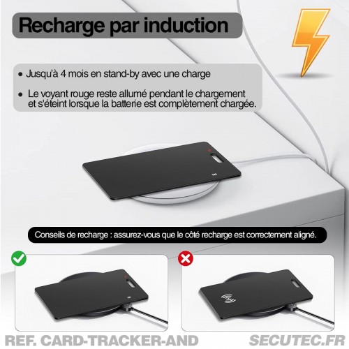 Rechargeable par induction (chargeur non fourni), la carte offre une autonomie en veille jusqu'à 6 mois. Sa fabrication en PVC, avec une technologie de soudage à froid, garantit solidité et discrétion. Grâce à sa certification IP68, elle est entièrement étanche à l’eau et à la poussière, pour une tranquillité d’esprit au quotidien.